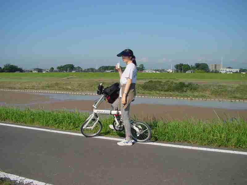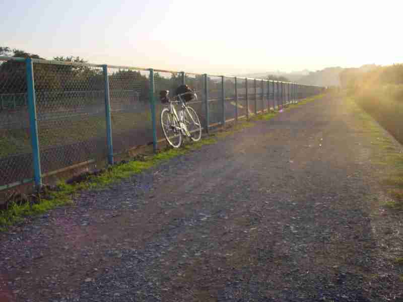 二度と行けないよ! こんな素晴らしい自転車道路があるところを! 強い親父の誘いでしぶしぶ走ってくれた長女。朝は3時半起き。日の出前の人っ子一人いない家の前の道路を最寄の駅に向けて4:45八王子駅発川越行きの電車に間に合う。前日の大雨で川も、緑もてんてこ舞い。太陽が昇り、コンビにで買ったドリンクで小休止。