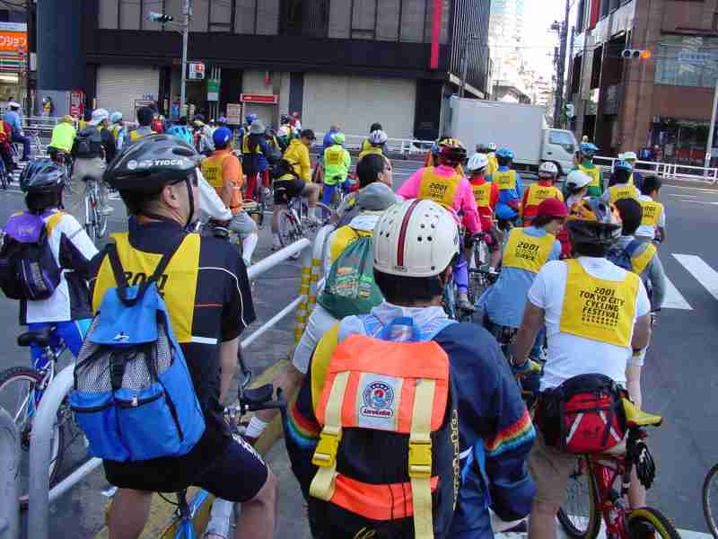 信号待ち。壮観なまでの一大集団。思い思いのヘルメットにリュックサック。